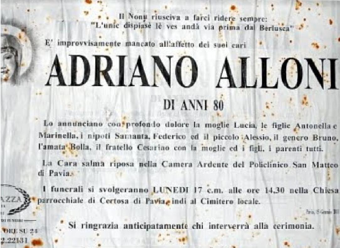 Il manifesto, che esprime lo sconcerto degli ultimi tempi e dettato dalla condotta tenuta dal noto leader comunista mangiabambini, è firmato dalla moglie, dai figli, dai nipoti e da altri familiari dell’ottantenne Adriano Alloni, il cui funerale si è svolto due giorni fa nella chiesa parrocchiale della Certosa di Pavia.