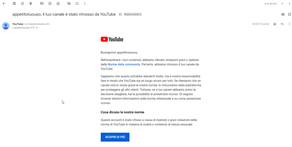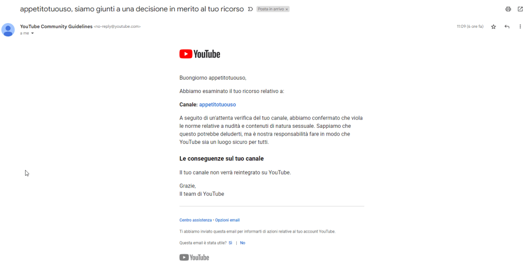 | Buongiorno appetitotuouso, Nell’esaminare i tuoi contenuti, abbiamo rilevato violazioni gravi o ripetute delle Norme della community. Pertanto, abbiamo rimosso il tuo canale da YouTube.Sappiamo che questo potrebbe deluderti molto, ma è nostra responsabilità fare in modo che YouTube sia un luogo sicuro per tutti. Se riteniamo che un canale violi in modo grave le nostre norme, lo rimuoviamo dalla piattaforma per proteggere gli altri utenti. Tuttavia, se a tuo parere abbiamo preso la decisione sbagliata, hai la possibilità di presentare ricorso. Di seguito troverai ulteriori informazioni sulle norme interessate e su come presentare ricorso. Cosa dicono le nostre normeQuesto account è stato chiuso a causa di ripetute o gravi violazioni della norma di YouTube in materia di nudità o contenuti di natura sessuale. SCOPRI DI PIÙ Qual è l’impatto sul tuo canale Abbiamo rimosso in via definitiva il tuo canale da YouTube. In futuro non ti sarà più possibile usare, possedere o creare altri canali YouTube.Che cosa puoi fareSe vuoi presentare ricorso contro questa decisione, puoi procedere come segue: Rivedi le Norme della community di YouTube. Presenta ricorso qui. Assicurati di compilare il modulo per i ricorsi nel modo più esaustivo possibile, includendo l’URL del tuo canale: https://www.youtube.com/channel/UCQatdoMm4lWNtBishkV3vwg Se hai ulteriori domande, non esitare a contattarci qui. Cordiali saluti, Il team di YouTubeTi abbiamo inviato questa email per fornirti informazioni e aggiornamenti relativi al tuo canale o account YouTube.© 2022 Google LLC d/b/a YouTube, 901 Cherry Ave, San Bruno, CA 94066 |