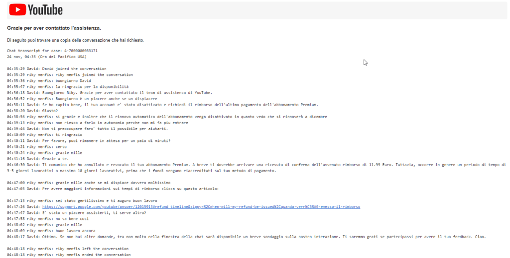 Cosi non mi sono arreso ed ho voluto recuperare almeno i 12 euro dell account youtube premium che non potrò usufruire e nel frattempo ho richiesto che mi venisse annullato il rinnovo automatico per evitare di fare il cornuto e mazziato della situa e trovarmi a dicembre a pagare pure il rinnovo 🙂