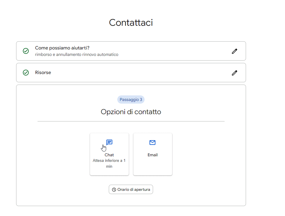 una volta che avrete correttamente compilato come possiamo aiutarti skippate risorse e andate avanti.. vi comparirà opzioni di contatto e cliccate su chat e da li ad un paio di minuti sarete aiutati da una vero G assistente 🙂