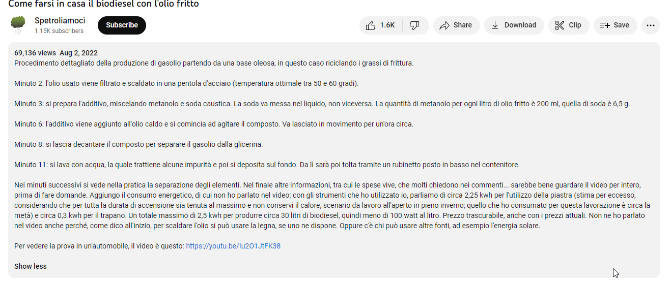 Produrre biodiesel fatto in casa e’ illegale. Utilizzarlo con l’autotrazione sul suolo nazionale o la vendita e’ illegale poiche’ e’ evasione. Informarsi per ogni stato la legge in vigore. In questo caso sono riuscito a procurarmi 20 l di olio dai miei vicini di casa che ho avvisato già più di un anno e mezzo fa e settimanalmente mi consegno loro bottiglia di olio esausto che non deve essere mai gettato nelle tubature della fogna infatti l’olio se finisce il fiumi altamente inquinante anche se non si direbbe perché è di origine biologica ma in realtà può essere veramente nocivo per l’ambiente Quest’olio non può essere immesso ora come ora all’interno del serbatoio della nostra autovettura principalmente perché contiene ancora briciole di cibo al suo interno e soprattutto perché è ancora troppo viscoso infatti il diesel per essere inserito all’interno della camera di combustione di un motore deve passare attraverso degli iniettori che possiamo immaginarci come dei piccoli spruzzi molto molto Minuti che rischierebbero di intasarsi se passasse del fluido troppo viscoso dobbiamo quindi rimuovere le sostanze che non ho viscoso quest’olio vegetale quali glicerina e sapone Per procedere in questo senso possiamo usare due elementi chimici nella fattispecie sto parlando di alcol metilico che viene venduto anche dai consorzi agrari è fondamentale acquistarne uno con una ottima percentuale di purezza stiamo parlando del 99% di prezzo se prendessimo dell’alcol metilico o no percentuale inferiore sicuramente la reazione chimica non si produrrebbe una maniera efficiente andremo semplicemente ottenere dei saponi È fondamentale mischiare all’alcol il secondo elemento chimico in questo caso sto parlando di soda caustica e come vedete nel video è do Bleak o unire la soda caustica all’alcol e mai viceversa altrimenti si potrebbe scaturire una reazione chimica improvvisa e l’aumento delle temperature potrebbe rompere il c Ora che è tutto pronto non ci resta altro che versare questo alcol metilico e soda caustica all’interno dell’olio vegetale per miscelare quindi l’olio io ho usato dell’aria compressa le bolle provenienti dal fondo tengono mescolato agitazione tutti quanti gli elementi per più di quattro ore Passate queste ore possiamo constatare con i nostri occhi è una reazione sta venendo infatti si presenta con una colorazione molto più lattiginoso e dobbiamo solo attendere In questo caso io ho fatto una piccola imperfezione ero abituato a fare questa procedura in estate ma direi che qua che fa veramente freddo è assolutamente necessario portare la temperatura l’olio infatti dobbiamo renderlo più fluido usando un riscaldatore vi lascio con il link un riscaldatore che secondo me potrebbe funzionare nella maniera migliore e dobbiamo portare l’olio a una temperatura tra i 50 e i 65° una volta raggiunta questa temperatura la reazione può procedere in maniera più omogenea e lasciamo quindi il composto fermo per all’incirca un giorno e mezzo Passato questo tempo ci ritroveremo sul fondo del contenitore gli elementi che rendevano troppo viscoso biodiesel quali sapone e Glicerina sul fondo mentre nella parte superiore troviamo un biodiesel perfettamente fluidO Video solo scopo illustrativo non replicate ciò che vedete tra parentesi manca anche un passaggio per evitare me medesi Possiamo quindi aspettare altre giornate in modo tale che ogni residuo di alcol metilico che non è riuscito a depositarsi insieme alla glicerina e al sapone possa evaporare via aspettando questo tempo il risultato sarà che tutti gli elementi contaminanti come glicerina Ho effettuato mere simulazioni per esigenze sceniche Se inseriamo all’interno del nostro contenitore 2 l di alcol metilico dovremmo trovare 2 l tra glicerina e sapone In ogni caso ci tengo a precisare di non replicare assolutamente le mie azioni , questo tutorial è solo scopo informativo e per essere replicato da professionisti nel settore che sanno esattamente come maneggiare e gestire tutta la situazione sia chimica che giuridica! Video puro scopo illustrativo per evitare problemi legali ho registrato questo video all’estero. Ho omesso un passaggio per evitare problemi di segnalazioni