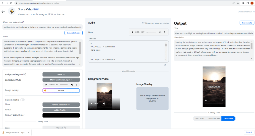L’utente deve inserire una descrizione del tema del video che vuole creare e QuickVid genera automaticamente una sceneggiatura, utilizzando le funzionalità di generazione di testo di GPT-3. Da parole chiave estratte automaticamente dalla sceneggiatura o inserite manualmente, QuickVid seleziona un video di sfondo dalla libreria di media gratuiti di Pexels e genera immagini sovrapposte utilizzando DALL-E 2. Successivamente, l’applicazione genera una voce sintetica attraverso l’API di text-to-speech di Google Cloud, combinando tutti questi elementi in un video.