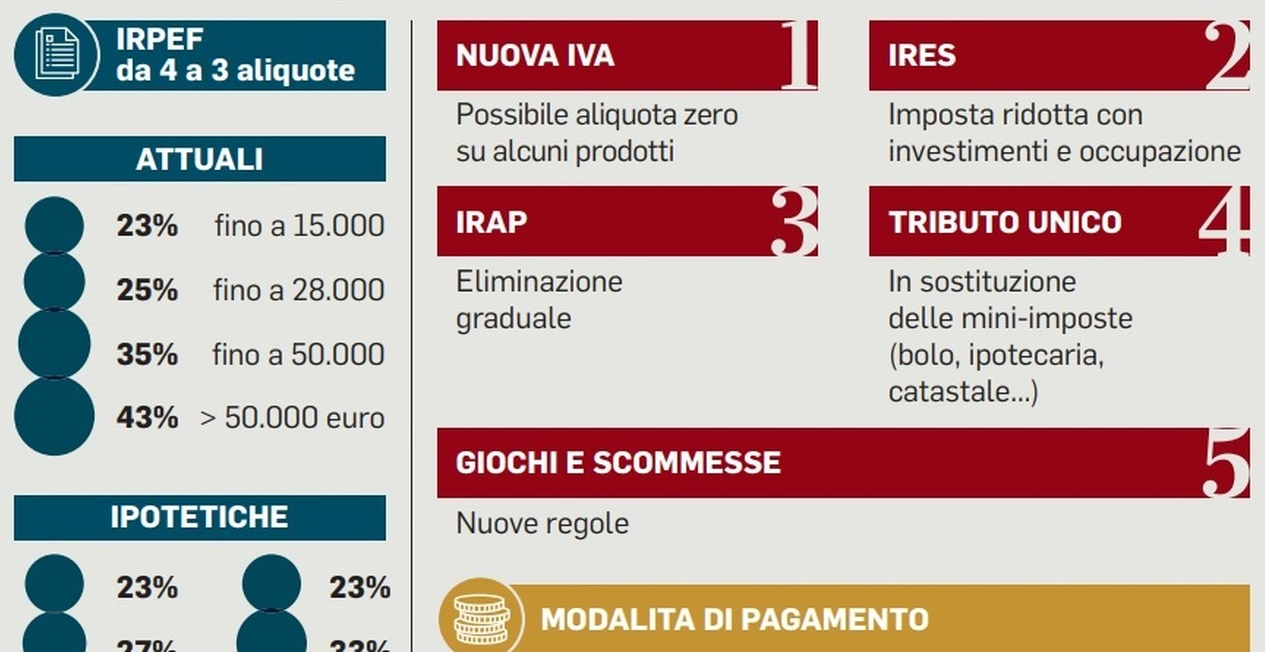 Il governo ha varato una riforma fiscale che prevede tre scaglioni Irpef e risparmi fino a 700 euro per i contribuenti. Si parla di “sistema ad imposta unica” preparando alla flat tax. L’intenzione del governo è di ridurre gli attuali quattro scaglioni dell’Irpef a tre dal prossimo anno. La delega prevede anche la revisione delle tax expenditures e l’equiparazione della No tax area per lavoratori dipendenti e pensionati.