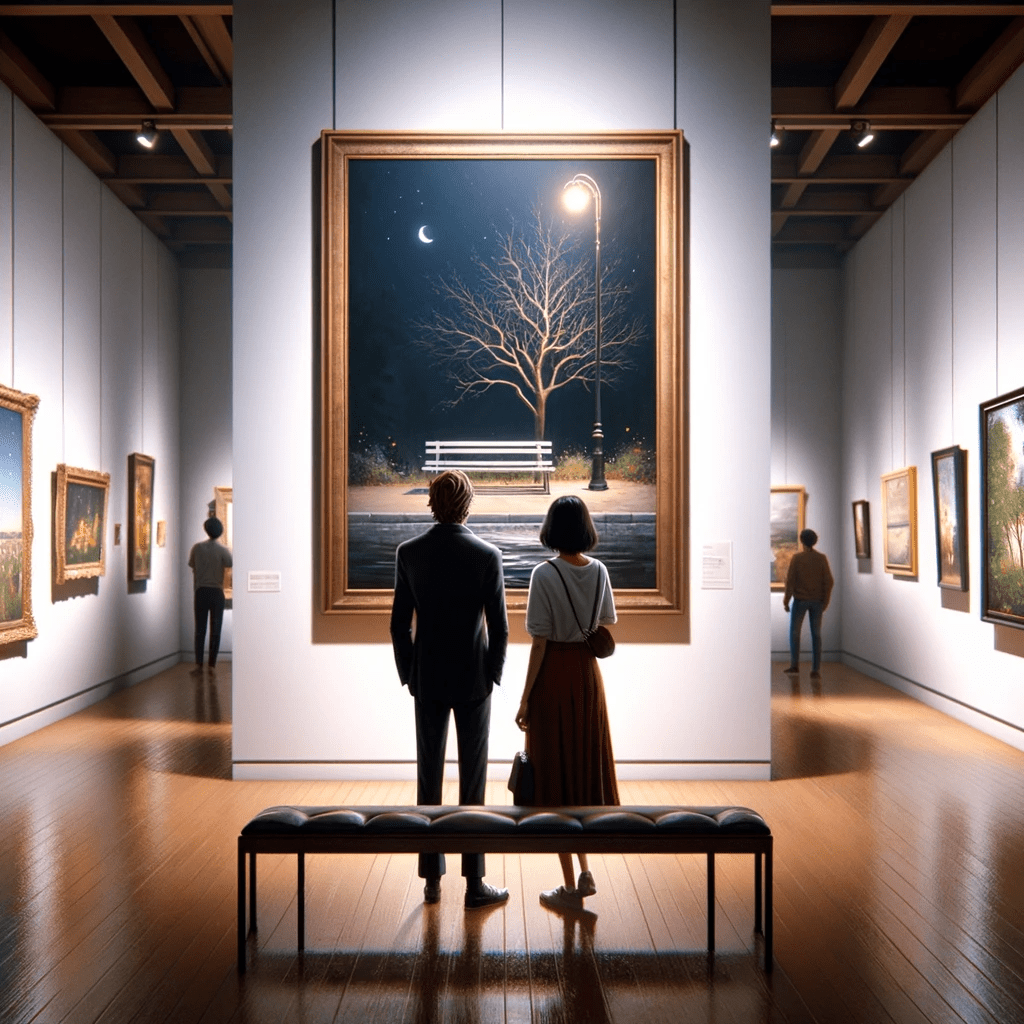 In un pomeriggio soleggiato, Luca si sentì ispirato a fare qualcosa di diverso e si diresse verso una galleria d’arte nel cuore della città. Non era il tipo da gallerie, ma quel giorno qualcosa lo tirava verso quell’esperienza. Mentre zigzagava tra le opere, un dipinto catturò la sua attenzione. Rappresentava una scena notturna con una panchina vuota sotto un albero spoglio, i colori vivaci ma con un tocco di malinconia che gli parve stranamente familiare.