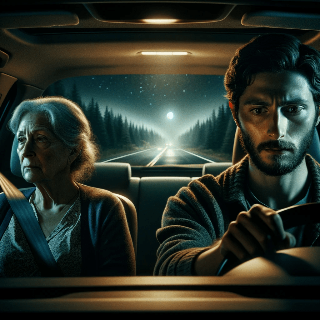 Il viaggio proseguì nel silenzio, mentre la notte avvolgeva la macchina in un abbraccio freddo.