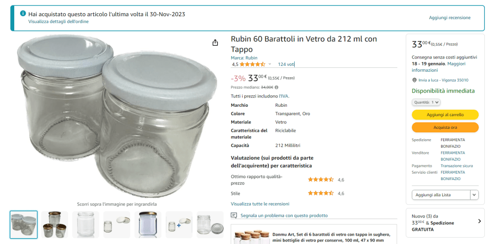 In una tranquilla mattina di Novembre, mentre il sole iniziava a diffondere i suoi raggi caldi attraverso la finestra della mia cucina, mi sono imbattuto in un tesoro nascosto su Amazon: 60 Barattoli in Vetro da 212 ml con Tappo a 33 euro.