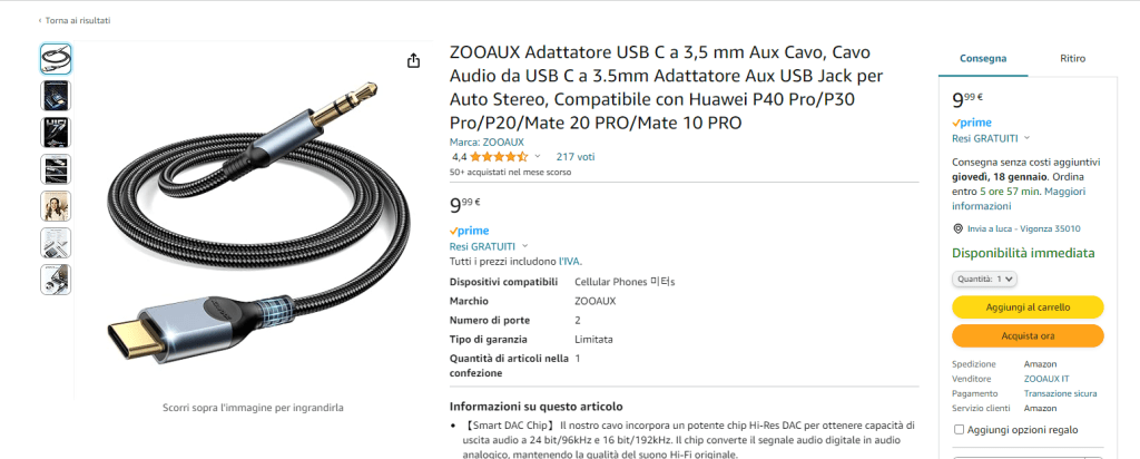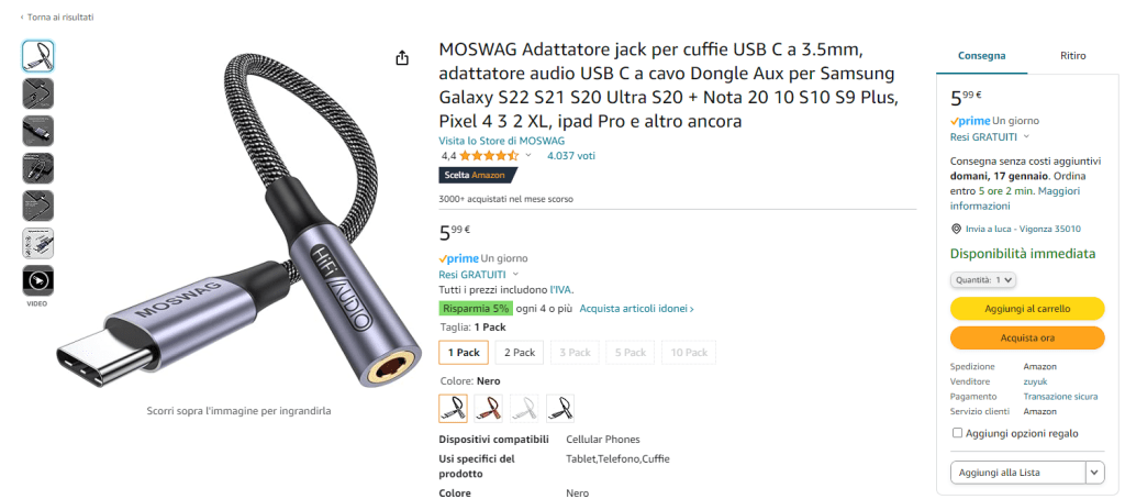 Link Amazon: Adattatore Audio Jack da 3.5mm a USB-C