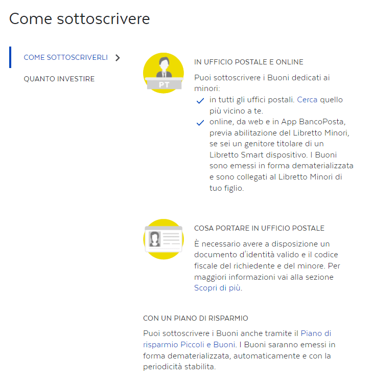 I Buoni possono essere sottoscritti in vari modi, sia fisicamente negli uffici postali sparsi in Italia sia online tramite il sito o l’app BancoPosta. Per la sottoscrizione online è necessario essere genitori del minore e avere un Libretto Smart attivo.