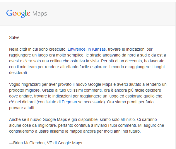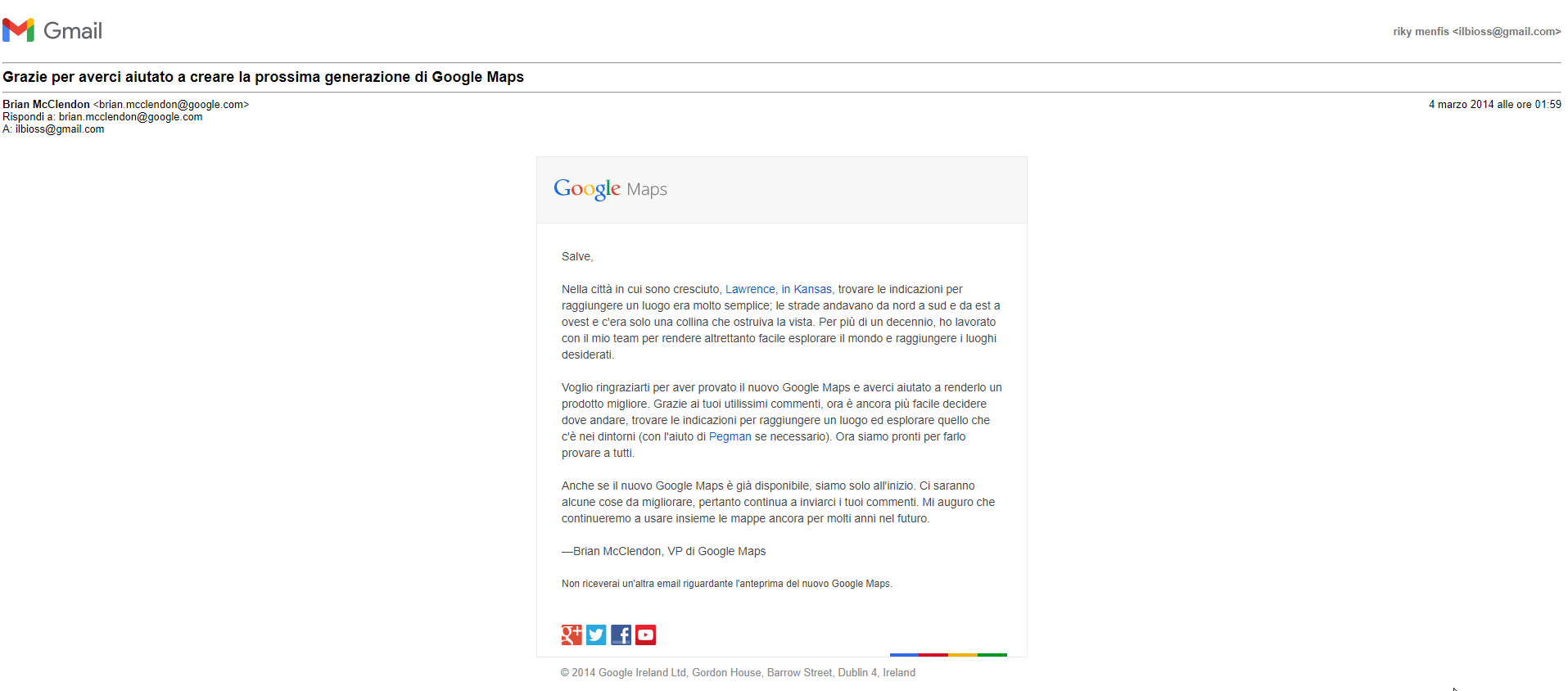 Quella e-mail proveniva da Brian McClendon di Google, una figura chiave nella storia di Google Maps ( ve la metto tradotta in italiano ).