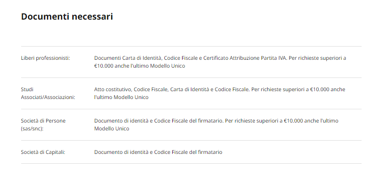 Per i liberi professionisti, ad esempio, sono richiesti Carta d’Identità, Codice Fiscale e Certificato di Attribuzione Partita IVA.
