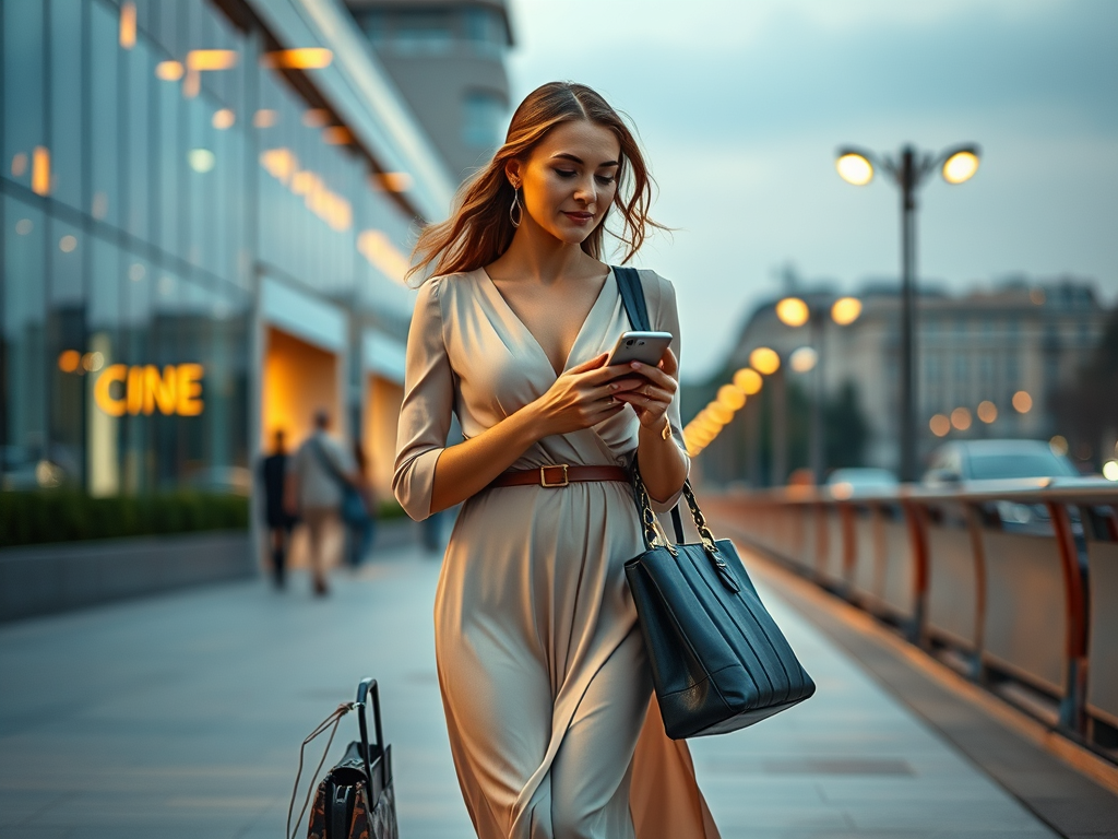 una donna con un abito lungo e svolazzante, borse della spesa in una mano e una valigia nell’altra, cammina districandosi tra decisioni e scelte d’acquisto.