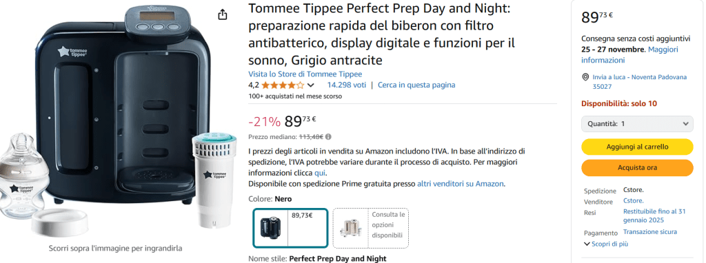 Ho acquistato questo piccolo genio su Amazon a 96 euro con Prime, completo di filtro e di un biberon Tommee Tippee.