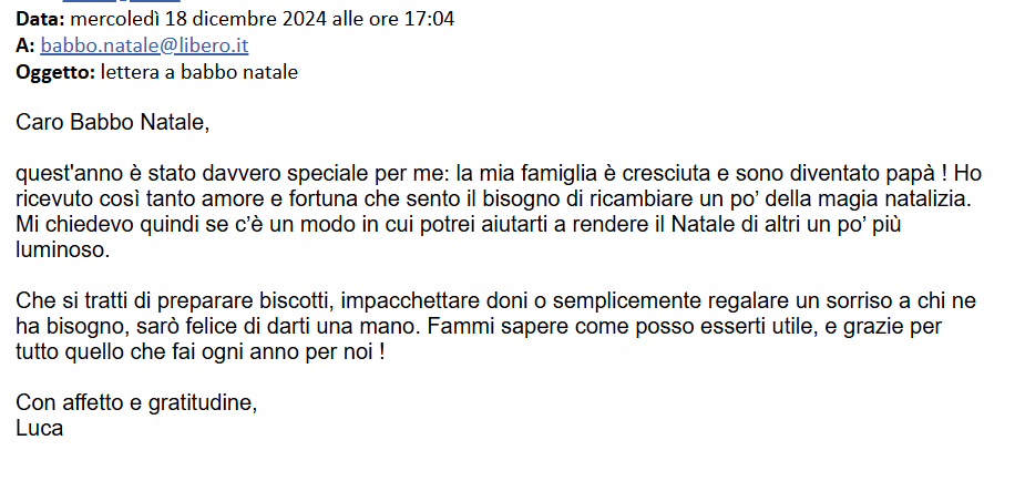 Vi auguro un Natale pieno di amore e generosità, proprio come quello che Babbo Natale ha risvegliato nel mio cuore quest’anno.