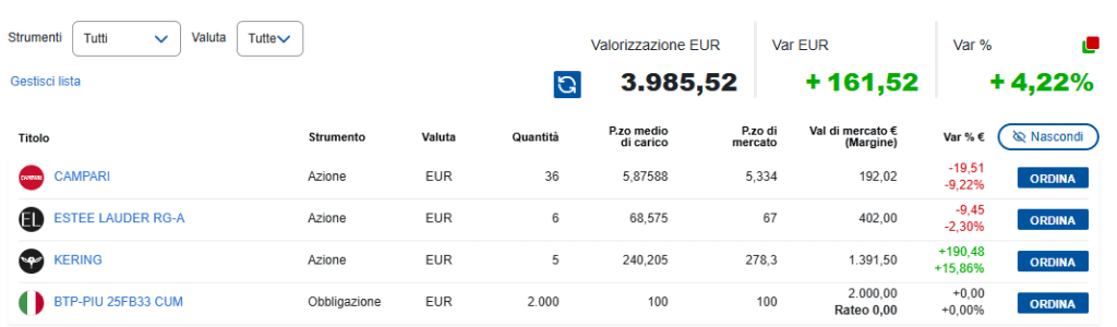 Dopo aver osservato una performance notevolmente positiva, ho deciso di liquidare le posizioni in Salvatore Ferragamo, con un guadagno del 26%, e in Kering, con un incremento del 16%. Questi risultati sono stati molto soddisfacenti, e credo sia il momento giusto per consolidare questi guadagni e reindirizzarli verso un’opzione più conservativa e strategica.