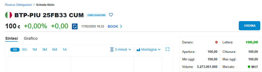 La mia scelta è caduta sui BTP PIU, che sono entrati in collocamento proprio oggi, 17 febbraio 2025. Questa decisione è stata influenzata dall’attrattiva di un investimento più sicuro e dalla prospettiva di un rendimento adeguato corretto per l’inflazione nel medio periodo.