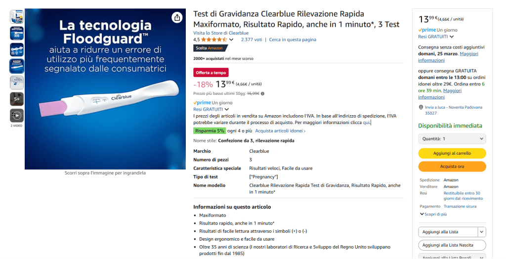 E allora vi dico: approfittate della Festa delle Offerte di Primavera Amazon (da domani 25 marzo) e fate come noi — anzi, fate prima di noi — prendete il test giusto, quello che funziona davvero in 1 minuto, con punta larga, impugnatura ergonomica e un risultato chiaro (+ o -).