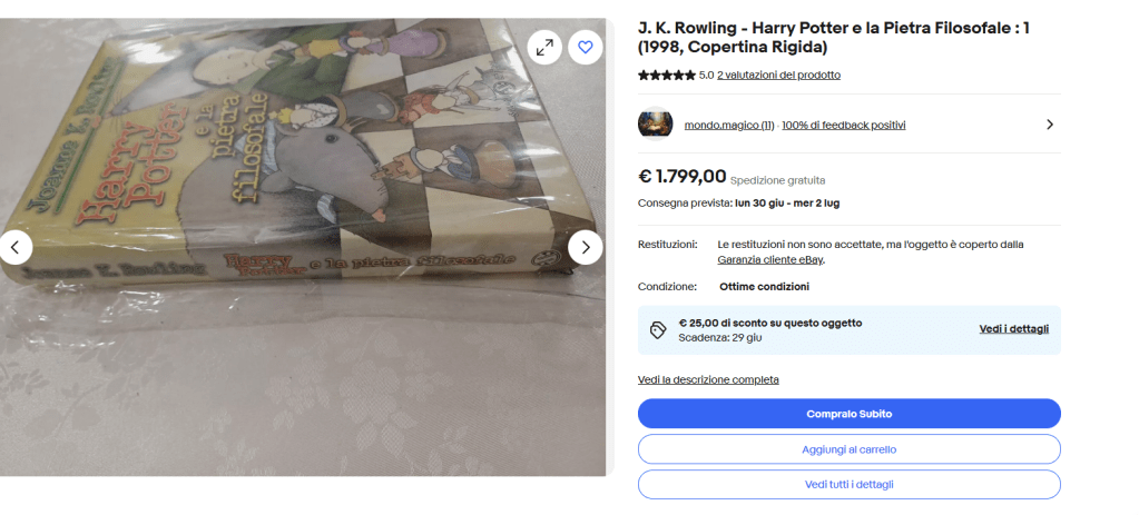 Parliamo della prima edizione italiana (Salani), quella che sui marketplace vola fra i 900 e i 2 000 € – ho screenshot da eBay a 1 799 € pronto all’uso.