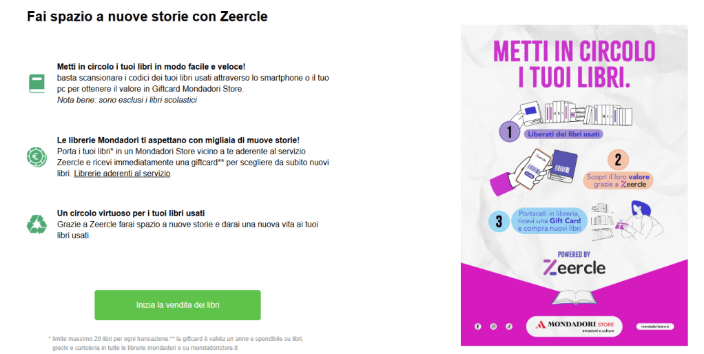 Quindi quando ho scoperto che Mondadori Store, in partnership con la startup Zeercle, ha lanciato un servizio di buy-back – tu porti libri usati, loro ti caricano una gift-card – ho fatto la ola mentale https://mondadori.zeercle.com .