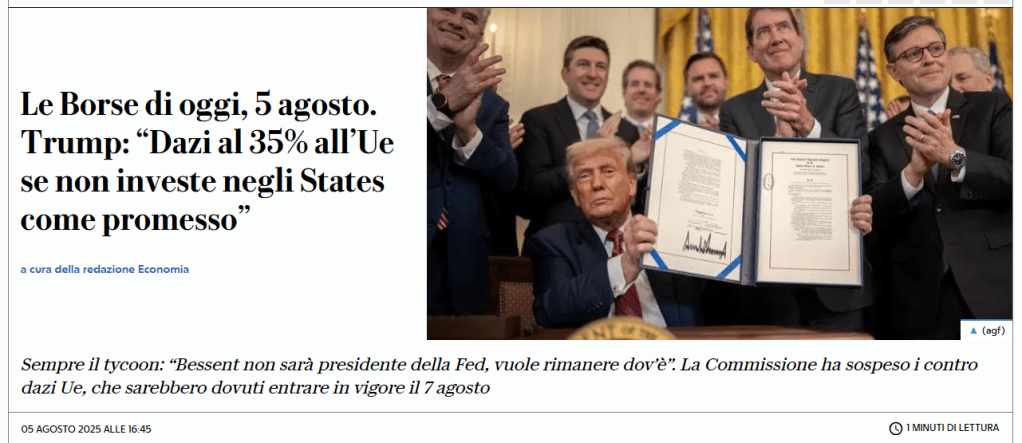 • Dazi USA: Trump ha esteso le tariffe (35% Canada, 50% Brasile, 25% India). L’UE per ora aspetta prima di reagire.