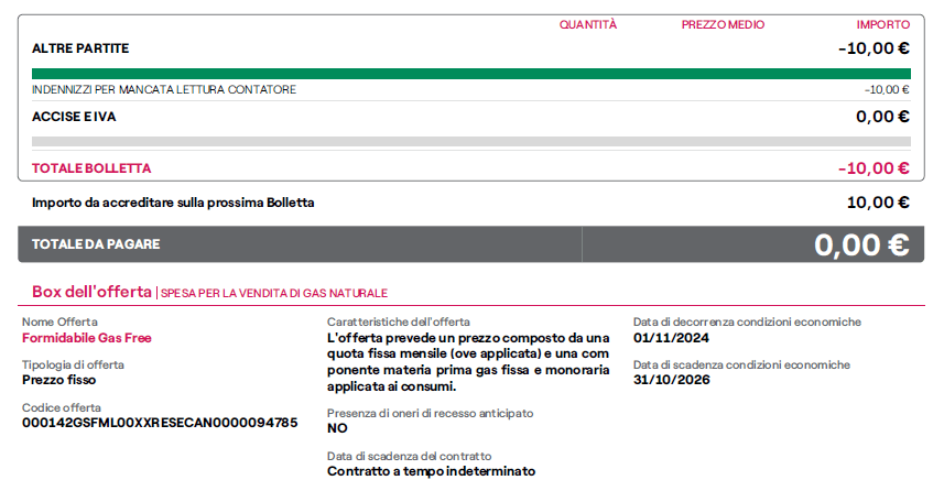 Sul fronte “consumi”: Nessun Consumo. Offerta in corso: Formidabile Gas Free, periodo ottobre 2025.