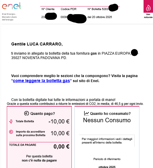 - Coerenza delle bollette: zero consumi a ottobre ? Ok. A novembre accendo ? Mi aspetto lettura e consumi veri, non oracoli.