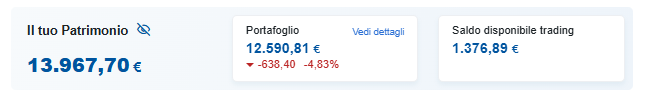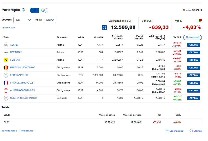 Ad oggi, 17/04/2026, la valorizzazione è di 12.589,88 euro contro un valore di carico di 13.229,20 euro. Tradotto: siamo a -639,33 euro, cioè -4,83%.